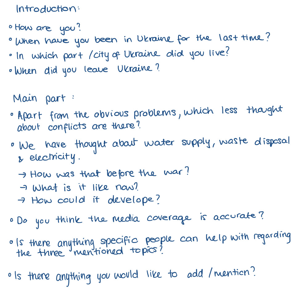 Vision: We would like to provide a realistic insight into the ecological/crisis situation in Ukraine. Therefore the best idea that came to our mind was to ask the people affected. An interview is the best option to reach this goal. We would like to interview several people in order to create a more differentiated insight. (Step 1)