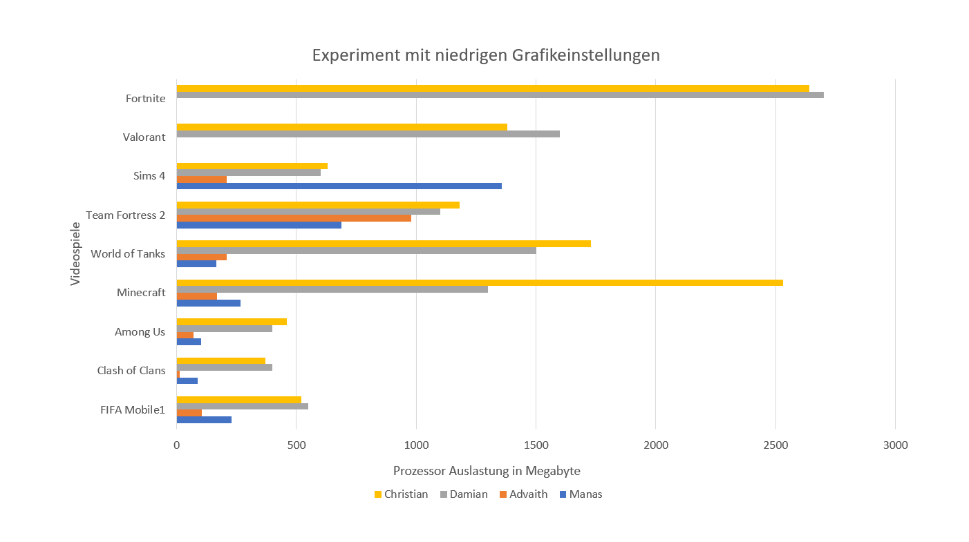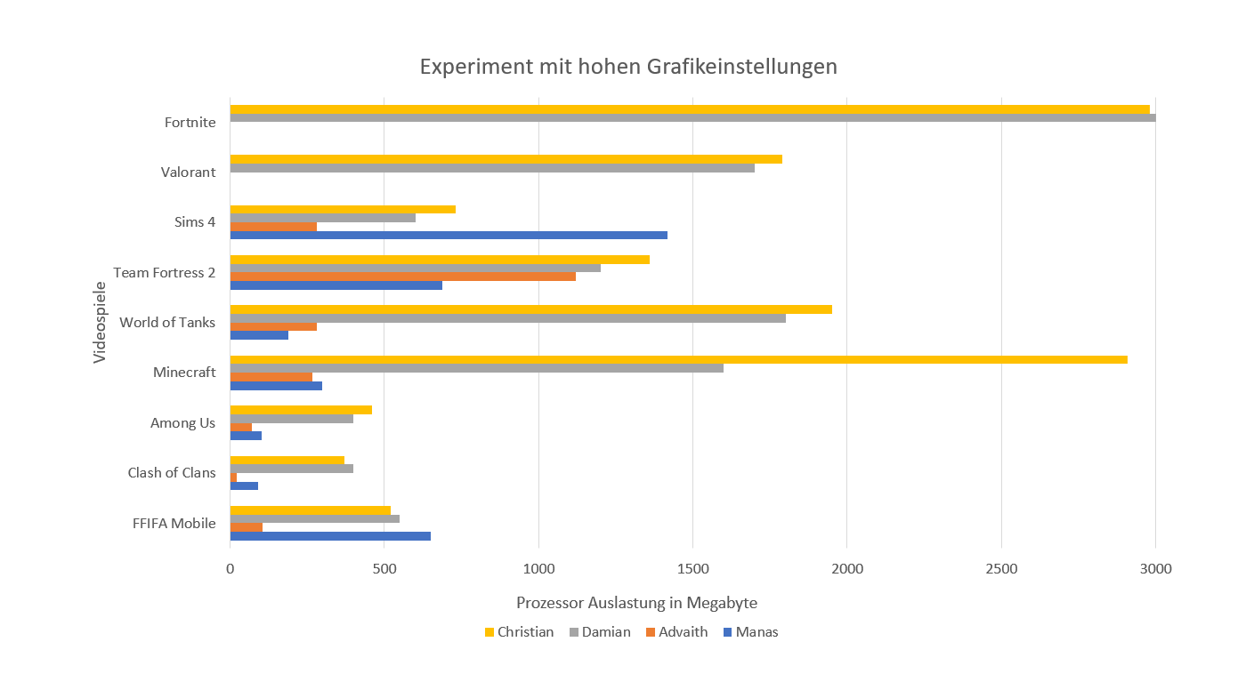 Folgend finden Sie zwei Diagramme, die die Ergebnisse der Experimente zeigen. Wir haben nur Spiele einbezogen, die jeder gespielt hat, ausser Fortnite und Valorant. Diese beiden Spiele benötigen sehr viel Energie und konnten daher nur von Hochleistungscomputern gespielt werden.