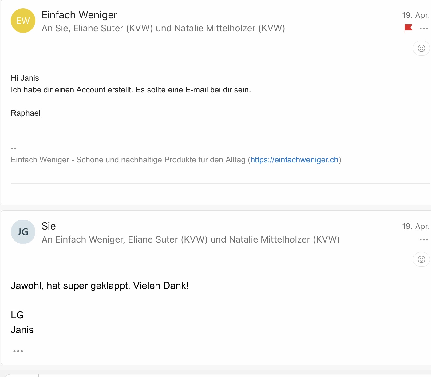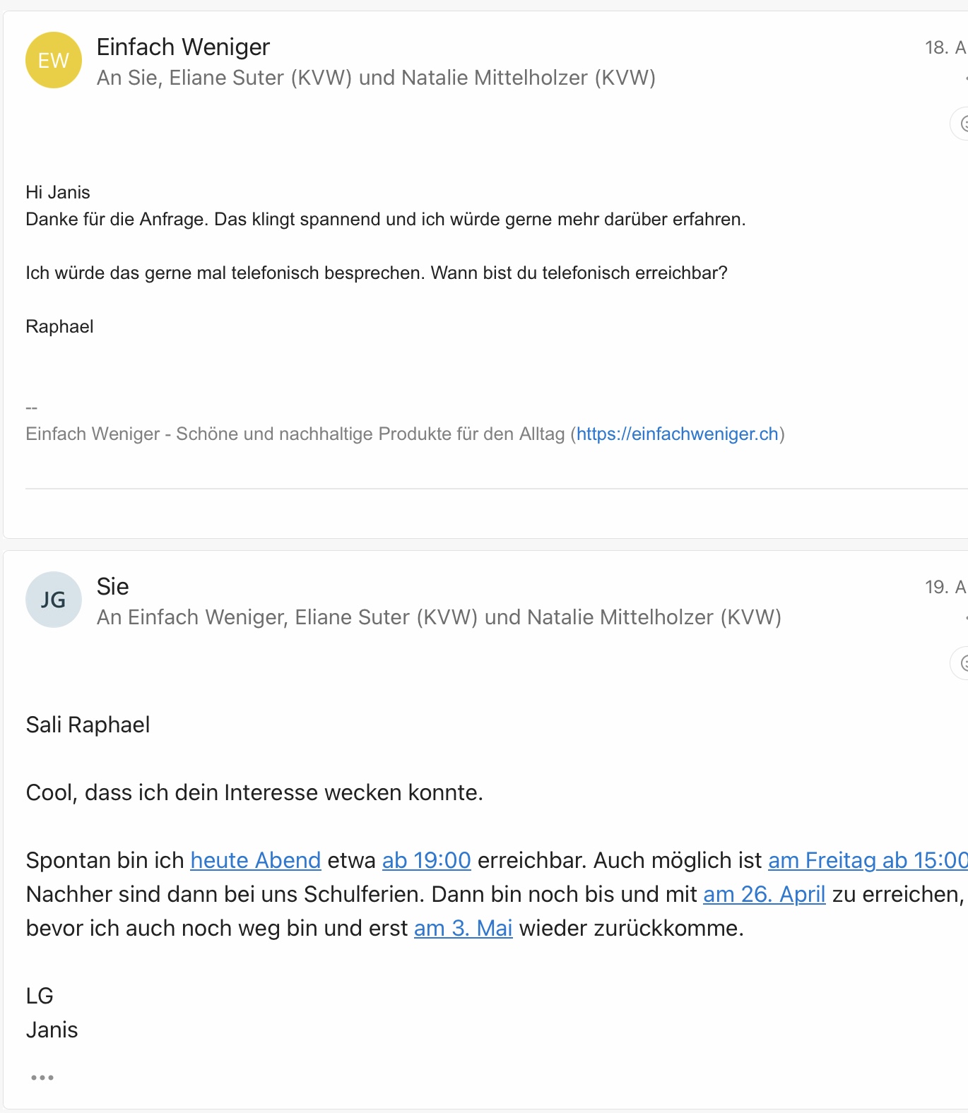 IDAF - Verlauf der E-Mails mit dem Blog „Einfach mehr“ 21. April 2023 Janis-Guebeli _VZ22 Zurich Wetzikon, Waste water, IDAF 2023 (0) Ebenso konnte ich bereits mit Raphael telefonieren. Wir haben abgemacht, dass ich selbst ein Login für ihren Blog bekomme und einen Artikel veröffentliche. Einen ersten Entwurf versuche ich bis am 26. April abzugeben.